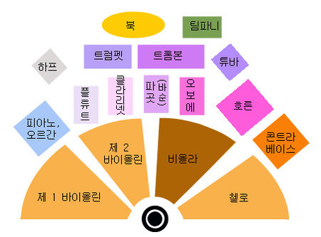 오케스트라 배치는 일반적으로 현악기가 지휘자를 중심으로 무대 앞에 빙 둘러서 앉고 그 뒤에 차례대로 목관 악기와 금관 악기, 타악기가 배치하는 것이 일반적인 배치 방법이다. 세부적으로는 각 악단과 무대 사정, 곡 성격, 홀의 음향 등에 따라 다양한 배치를 할 수 있다.