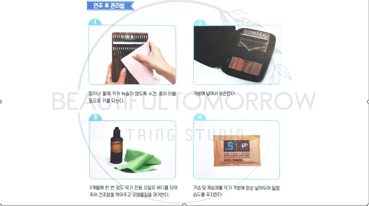 ♬ 칼림바는 사용 후 부드러운 천으로 건반과 바디를 닦아 케이스에 넣어 보관하는 것이 좋다.